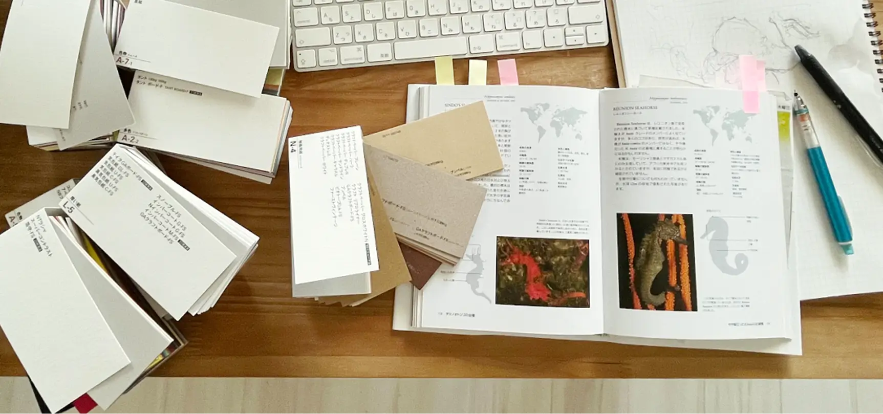 紙やら図案ネタ探しやらでもってイメージの着想を得ようと、ない知恵を絞っても何も出てこない時の机の上